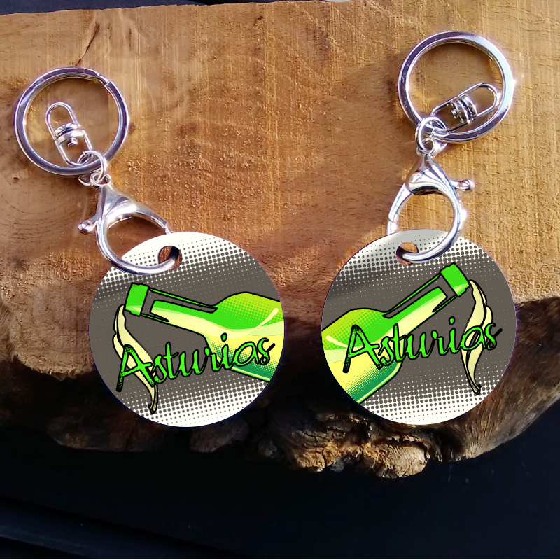 LLavero de madera con impresión en doble cara, colgante y anilla metálica.